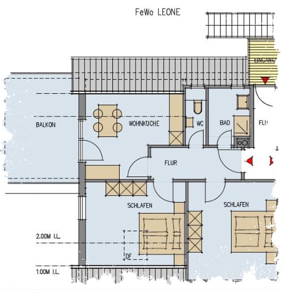 Willkommen in der Ferienwohnung LEONE. Die 60 m² große Wohnung befindet sich im 1. Stock und ist über eine Außentreppe bequem erreichbar. Ideal für Familien oder Paare bietet sie Platz für bis zu vier Personen.